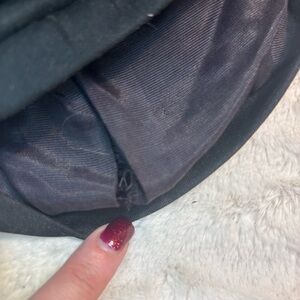 Black stylish hat with the turban knotted design. No material tag, but this is a soft fabric that is lined with a smoother nylon-type fabric.