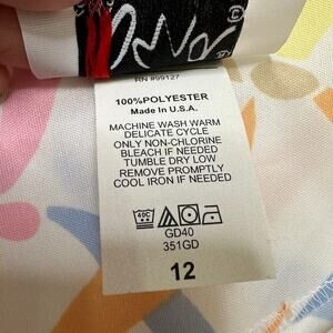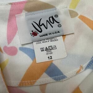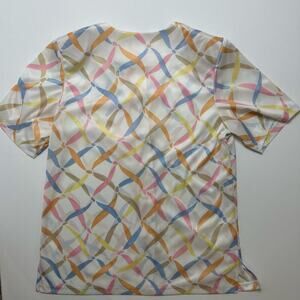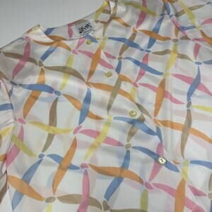 Vintage 1960’s Vera Button Front Top in Trellis Print. 100% polyester. Made in USA. Stylized trellis print with white background and pink, blue and yellow design. Short sleeves. Shoulder pads. Womens size Large. Vintage “as found” condition.