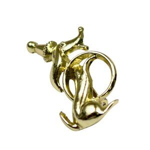 Whimsical and full of charm, this vintage 1960s brooch by Volupte features a circus-style dachshund balancing a hoop—captured in gold-tone metal with delightful detail. Though unsigned, it’s a known Volupte design and measures approximately 2" tall. A sweet conversation piece in very good vintage condition, perfect for collectors or anyone who loves playful mid-century flair