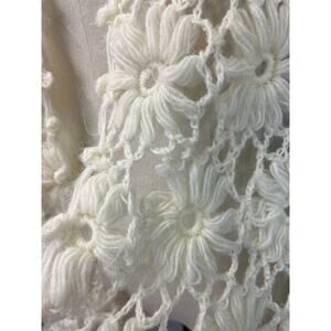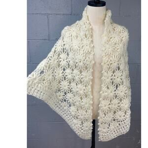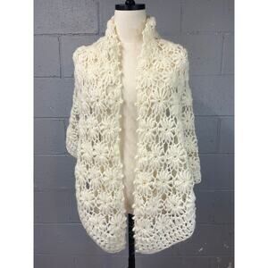 White acrylic nylon shawl sweater style wrap hand crocheted in a floral pattern.