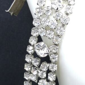 *Description: This is a beautifully designed bracelet in silver tone gold plating with several sizes of clear rhinestone chatons. It is designer quality and must have had a hang tag identifying the designer. This bracelet is four rows of rhinestones wide with a design that replaces smaller rhinestones with larger ones in some areas. Rhinestones are full of sparkle and all in place. This would be a great wedding bracelet or wonderful for any formal event. It would also make a great gift.