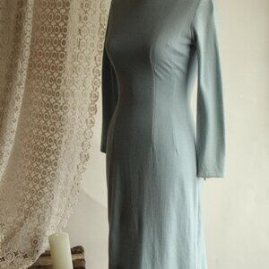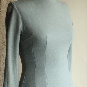 Classic vintage dress from the 1960s in pale blue wool. Simple wiggle dress style with long sleeves, a kick pleat in back and high neck. Lined through the torso in a white nylon tulle-like mesh. Metal zipper down the back and on the sleeve ends. Label reads, "Jonathan Logan" and has another that says, " Chumley Sportswear Charles F Berg Portland Ore". This is a small I'd say but do see measurements below.