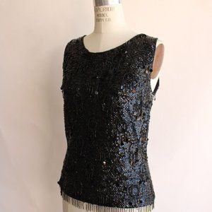 Sparkly sequined vintage sweater top circa 1960s. Opaque black lining covered in sparkly sequins and black micro beads with a bit of fringe along the bottom. Tank style, cropped, slightly boxy shape, metal zipper down the back. Label reads: Forecast Shops, made in Hong Kong, size M. 100% wool with a rayon lining.