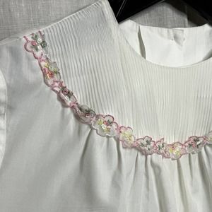 Features: Lightweight, Front Pocket, Bib neckline with Pink, Green, and Yellow Floral appliqué detail, Ladies Garment Workers Union tag in place