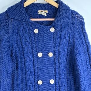 Features: Long sleeve, Double Breasted, Button Front, Gold Buttons, Long Line, Chunky Knit, Collared, Navy Blue