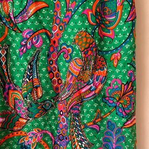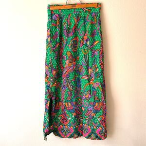 VINTAGE 1960S BIRD PRINT MOD SKIRT WITH SOME GLITTER OUTLINES BY MALBE ORIGINAL NOVELTY PRINT SKIRT BIRD PRINT. TAG READS A SIZE 16, HOWEVER SKIRT MEASURES 30" AT WAIST. UNION MADE