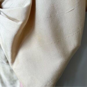 No size or materials tags, but it looks and feels like silk and is a golden straw color.