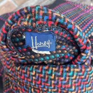 Primary color is black. Additional colors are blue, green, purple, red, beige, and teal. All measurements are flat and approximate turtleneck length 20 inches long 12.5 inches wide wingspan/arms 57 inches. Shoulder to hem 37”. From a distance, the colors look distorted. Last photo is true colors.