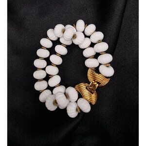 Double-strand bracelet with richly molded white beads, each bead featuring a ribbed melon-like contour