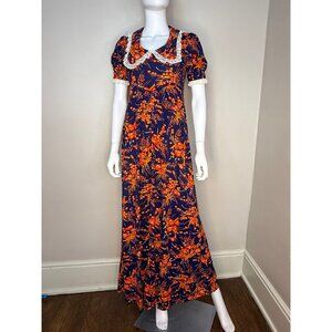Vintage 1960s/70s Navy Blue and Orange Floral Maxi Dress, Size Small, Lace Trimm