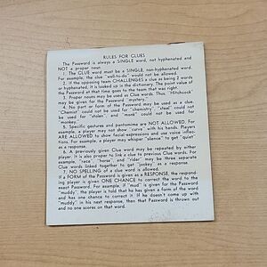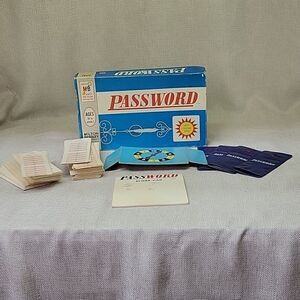 A great vintage 2962 Password game by Milton Bradley. Comes with a score pad..some sheets are gone but there are plenty left on the pad. 2 sets of cards "A" and "B". 4 card holders and a scoring dial. In great shape. Box shows minimal wear.