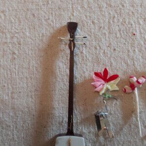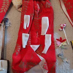 Vintage Barbie Travel in Japan Kimono and accessories. # 0821 in 1963 exclusive fashions by Mattel Book 3 (included!!!). Red kimono, gold & white obi, flower with silver dangles hair ornament, flower bud hair stick ornament, fan, two white socks, two white glove, samisen string instrument (missing one piece, see pic).