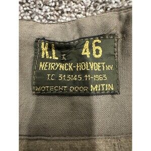 The Vintage 1963 Military Mitin Pants in US Army Green Wool are a unique and authentic piece of clothing with a military theme from the 60s. Crafted from wool fabric with a button closure, these cargo-style pants have a 31-inch inseam and are designed for regular fit. The NV Neirynck-Holvoet brand adds a touch of history to these unisex pants, making them a stylish and functional addition to any wardrobe. With a size 28 waist and 28-inch size, these pants feature pockets for added convenience.