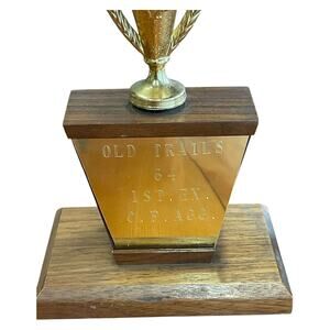 Pair of 1964 vintage shooting trophies awarded at the Old Trails event. Each trophy features a cast metal gold-tone topper—one a revolver and one a marksman figure—mounted on a wood and brass base engraved with category details. Unique collectible set ideal for firearm sport history or man cave décor. Great midcentury display from competitive shooting culture.