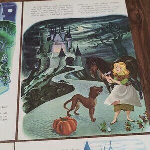 Walt Disney's Fantasyland 1965 book pages. These are from a damaged book. The pages were removed and will have raw edges as shown. Approximately 8x10 sized, perfect for a nursery or kids play area. Many other stories listed as well including: Snow White, Cinderella, Classic Children's Rhymes, Pinocchio, Dumbo, Sleeping Beauty. Very unique style of images. Excellent condition pages (no water damage or fading).