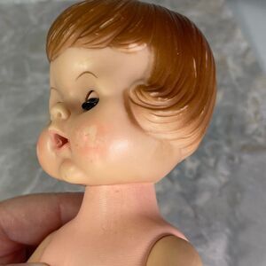 Vintage 1965 Uneeda Hard Body baby doll. She has a rubber face and arms and hard plastic body and and legs. Her cheeks show wear on the coloring. She has some dirt staining ( slight) on bum and various areas. The dress was on her but not sure if came with her. Dress has been laundered. She’s a drink n wet doll with open and close eyes.