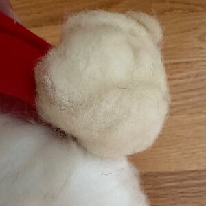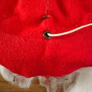 Vintage 1967 Shiny Brite Max Eckhardt Musical Santa Face Jingle Bells. Hard plastic surrounded by cotton around Santa's face to make his beard and the trim on his hat. String hangs 9" below Santa's chin and when pulled plays "Jingle Bells." See video to hear clear quality of sound. Bright, colorful face that has not faded. There are condition issues as seen in pics 11 and 12. There is a hole in the plastic of Santa's forehead. It is easily covered by the cotton of his hat. There is a break in the plastic, bottom back side, seen when the red felt backing is lifted (pic 11.) The cotton of the beard has lost its original groomed shape. There is some lint in the cotton; very minimal.