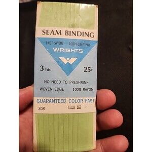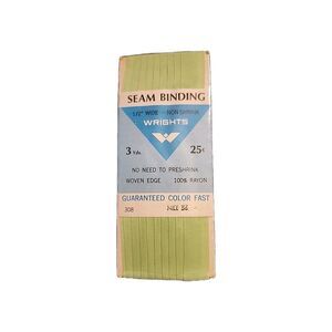 The Vintage 1969 Seam Binding Tape by Wright's is a single pack of green woven rayon trim that has never been opened. Made in the United States, this seam binding is designed for sewing and crafts, featuring a color-fast and non-shrink material with a woven edge for a durable finish. This unique and retro find is perfect for adding a touch of vintage charm to your projects.