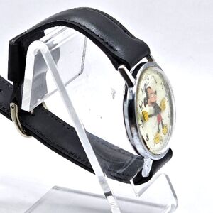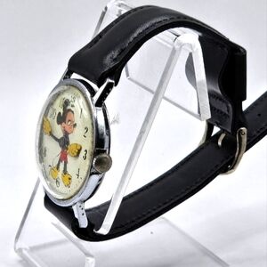 Large 32mm round silver case that has light surface wear and scratches. 12-hour white dial with a large and colorful Mickey Mouse graphic that has animated arms and yellow gloved hands. The 2 piece black leather watch band is not original to the watch, the condition is very nice and is functional.
