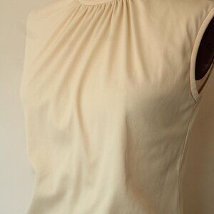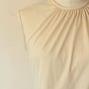 Darling vintage 1970s blouse top in ivory. Sleeveless with sweet gathers at the neck and a zipper in back. Label reads: Teddi. Medium size I'd say but do see measurements below. Looks and feels like nylon to me.