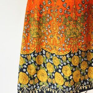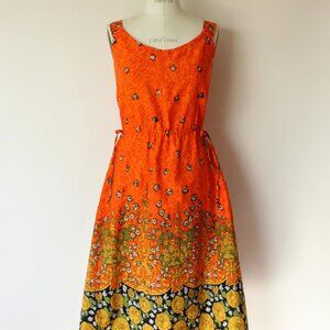 Gorgeous vintage sun dress circa the 1970s, maybe late 1960s, maybe early 1980s. Orange and black floral print with gold and green and bits of white. Has drawstring ties at either side of the waist to adjust it to fit and two front pockets. Probably in the small to medium range but do see measurements below. Label reads; None. Unlined. Looks and feels like cotton.