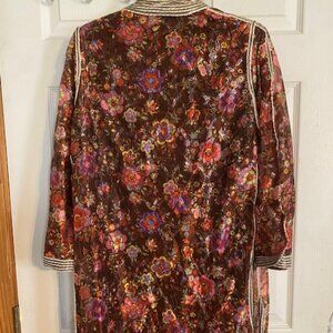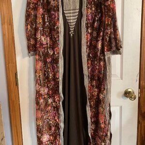 This is a rare and beautiful vintage 1970's 3 piece dress in excellent condition, made in Morocco, dress is brown with gold and white trim, small slit on both sides at bottom, sheer cover has gold thread in fabric, slits on both sides to hips, beautiful flare arms with same trim as dress, both are full length to the ankle, has a matching belt that ties that can be worn with the dress or the sheer cover. It is a stunning piece. Measurements: Chest 40 in, waist 42 in, size small. Fabric is polyester.