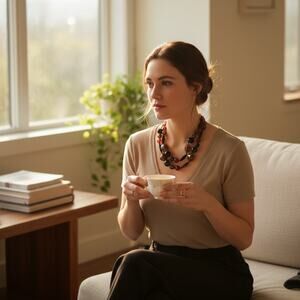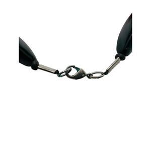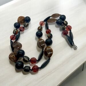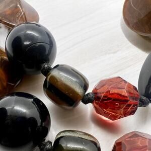 Vintage 1970s hand-knotted acrylic bead necklace featuring an array of strikingly large beads in amber brown, deep black, smoky tiger-stripe, and translucent ruby red hues. Each bead—ranging from 17mm to 28mm—is individually knotted on cord, showcasing the bold and artistic craftsmanship typical of the 1970s statement jewelry era. The necklace measures a dramatic 40" in length, allowing for versatile styling—wear it long for a sleek silhouette or doubled for a layered look. Acrylic jewelry of this period gained popularity for its lightweight feel and sculptural color effects, echoing the glamour and experimentation of retro fashion. Finished with a lobster clasp closure.