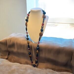 Vintage 1970s Acrylic Statement Necklace-Amber Brown Black Red-Hand Knotted-40''