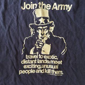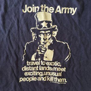 Vintage 1970s Anti War T Shirt “Join the Army Travel To Exotic Distant Lands” LG