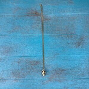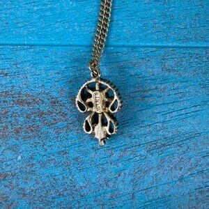 This vintage 1970's necklace features a faux red cabochon set in a scroll-design gold tone pendant. A timeless and elegant piece that adds a touch of vintage charm to any outfit.