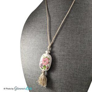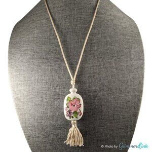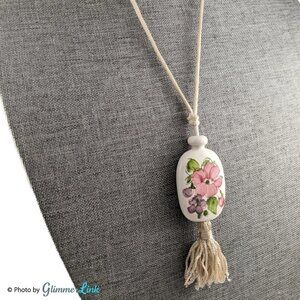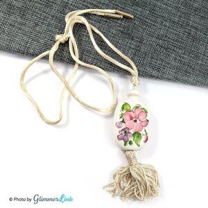 Vintage 1970s tassel necklace by Avon, from the Tender Blossoms collection. The hand painted ceramic pendant features pink, purple, and green floral motifs on white, with a soft ivory cord and matching tassel.