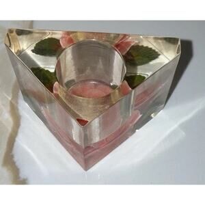 Vintage 1970’s Bircraft Pink Rose Green Leaves Triangular Lucite Candle Holder