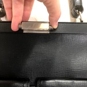 Black leather with silver metal hardware. Front pinch clasp closure.