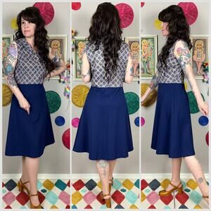 What a cute little sporty 70s dress! Features a sleeveless bodice with a split neckline and collar, fitted waist and a bell shaped a-line skirt. Back zipper and hook closure. Top is made from a more silky feeling polyester material and comes in a blue, white, yellow and orange geometric shape print. Skirt is a solid blue poly knit.