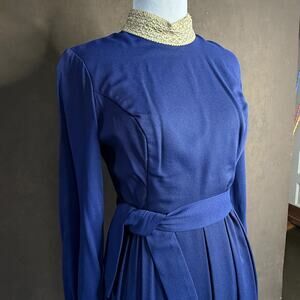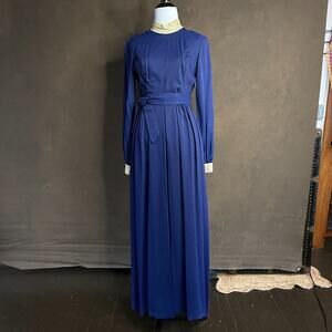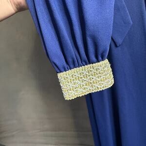 Stunning vintage 1970s women’s wide-leg jumpsuit in royal blue with metallic gold trim at the high neckline and cuffs. Features long bishop sleeves, a belted waist, and ultra-wide palazzo-style legs for that iconic disco-era silhouette. Back zip closure with MAK zipper, typical of the period. A glamorous one-piece outfit perfect for cocktail parties, holiday events, or collectors of true vintage fashion.