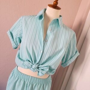 Like new. Vintage - Blue and Green Striped Petal Pusher Set. Short sleeve button down blouse. Elastic waist with side pockets petal pushers.