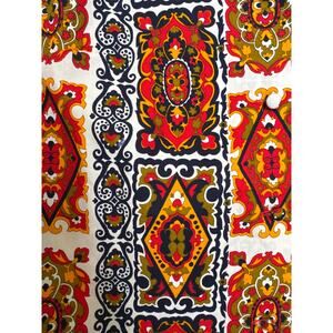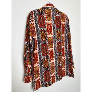 Authentic vintage 1970s button-down shirt in crisp cotton with a striking geometric/medallion print in red, mustard, black, and ivory. Features an oversized pointed collar, long sleeves, and a classic straight cut—perfect tucked in or worn loose. Tag reads size 12 (vintage sizing, fits closer to a modern medium, check measurements). A bold retro statement piece ideal for boho styling, mod fashion, or festival wear. Rare true 70s collectible shirt in vibrant colors.