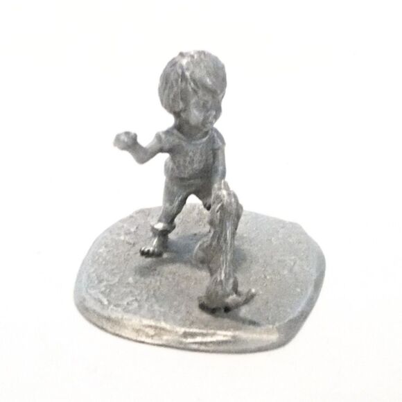 This charming pewter miniature figurine captures a heartwarming moment between a boy and his playful pup. Crafted with fine detail, it depicts a young boy tossing a ball while his eager little dog looks on. The figurine is dated 1977 on the bottom, making it a wonderful collectible from the 1970s. Measuring approximately 1 3/4" in height by 2 1/4" in length, this delightful piece is perfect for collectors of vintage miniatures, dog lovers, or those who appreciate nostalgic childhood scenes. Add a touch of timeless charm to your collection with this adorable pewter keepsake!
