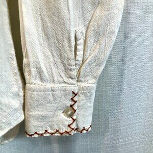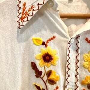 Nice vintage shirt for a boy or someone very petite. From the Seventies, this shirt is all cotton in a natural / ivory muslin color. Embroidered flowers and leaves on the front, collar and cuffs. Yarn colors are in goldenrod, yellow, brown, rust and tan (VERY 1970s colors!). Buttons up the front with cream plastic buttons. Long, pointed collar. Long sleeves with button cuffs. Back shoulder yoke. Loose fit with a shirt tail hem. No label or manufacturer's tag. There is a small size tag at the back neck, but is faded and unreadable. Most likely made in Mexico, as this was a very popular style and look at the time. In good vintage condition, with a small, light grey spot on the right shoulder (have not tried to wash off) and a thin run (?) in the fabric, which looks like a manufacturer's flaw. A fun and unique shirt!