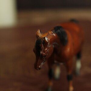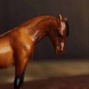 Charming vintage Breyer model horse from the 1970s. G1 mold number #5011, this is the miniature bay Arabian Mare, modeled by Maureen Love, originally done for Hagen-Renaker. Measures just under 3.5" from end of tail to tip of nose and stands about 2.5" tall. Has the Breyer mark and date of 1975 underneath.