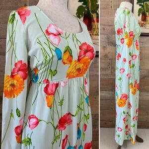 Vintage 1970’s polyester knit fabric colorful floral maxi dress. Dress has empire waist, back zipper, back bottom slit, scoop neck and long sleeves.
