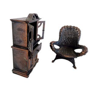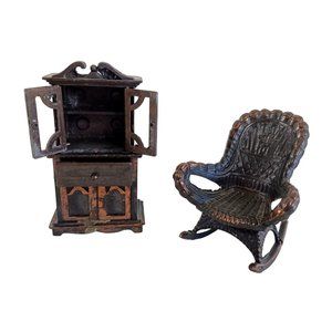 Vintage 1970's Bronze Die Cast Dollhouse Miniature 3" Cabinet & 2" Rocking Chair