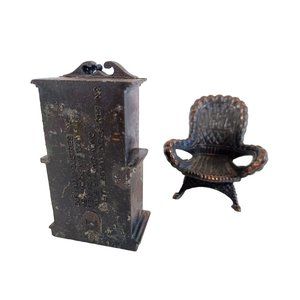 This Vintage 1970's Bronze Die Cast Dollhouse Miniature set by Durham Industries includes a 3" Cabinet and a 2" Rocking Chair. Perfect for adding a nostalgic touch to your miniature collection.