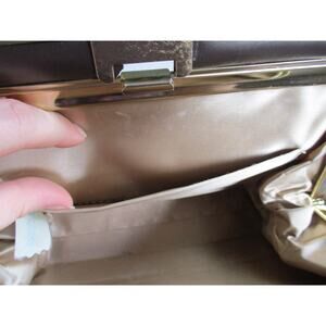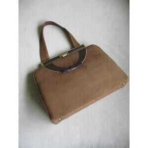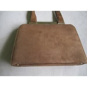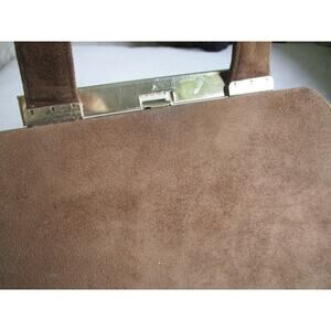 Vintage Life Stride suede bag in medium brown tone with darker brown leather accents and bow. Brass hardware at clasp. One pocket inside. Bag is 10.25x7.5 and straps are 4" apart and 5.5" high.