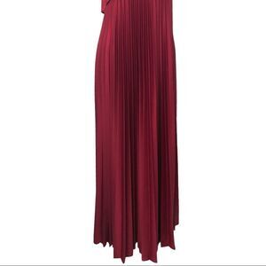 Vintage 1970s burgundy pleated maxi dress featuring a flutter overlay bodice and a flowing pleated skirt. Designed with a zip back closure and elegant drape that flatters the waist and shoulders.