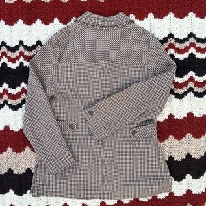 Campus Casuals of California brown and white gingham long sleeve button up with a large Barrymore collar, pockets on each side, and two button tabs on the back waist.