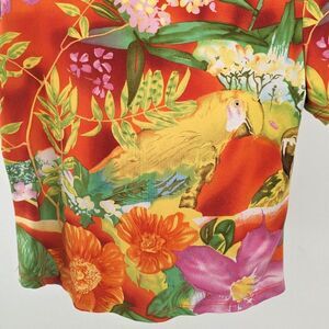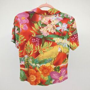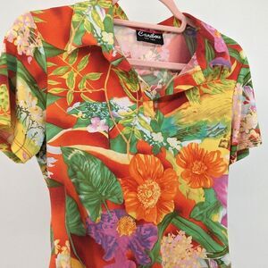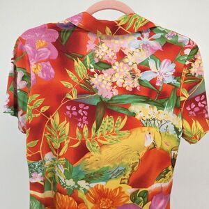 Vintage 1970s Caribou New York polo short/t-shirt with collar. Floral/Hawaiian print. Back features parrot print. Short sleeves. Top is in good vintage condition with some loose threads.