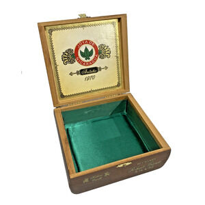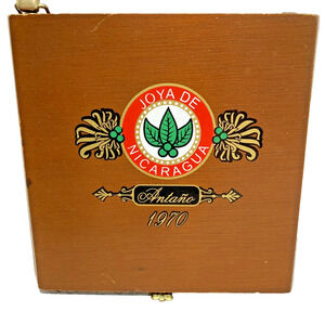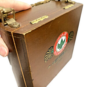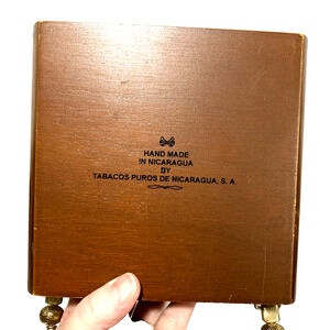 Vintage cigar box purse - 1970s Joya de Nicaragua brand Antana. Brown wood with beaded top loop handle done in a variety of goldtone metal beads. Interior is lined in green satin and retains the original cigar label - fun and so unique! Sadly, there is a flaw-- the flip clasp at the bottom of the bag doesn't hold firm - new owner will need to replace or tighten this in order to carry the bag securely. In otherwise good vintage condition - certainly a conversation piece when carried - a nice addition to a box bag collection!