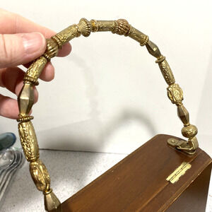 Vintage 1970's Cigar Box Purse Wood Case with Gold Beaded Top Loop Handle FLAW