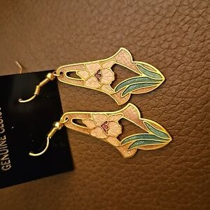 Vintage 1970s Cloisonne Floral Iris Long Dangle Hook Art Deco Earrings